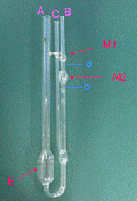 烏氏粘度計是氣承懸柱式可稀釋的粘度計,把預先經嚴格洗凈,檢查過的潔凈粘度計垂直夾持于恒溫槽中,使水面完全浸沒小球M1。用移液管吸10ml甲苯,從A管注入E球中。于25℃恒溫槽中恒溫3分鐘,然后進行流出時間t0的測定。用手捏住C管管口,使之不通氣,在B管用洗耳球將溶劑從E球經毛細管、M2球吸入M1球,然后先松開洗耳球后,再松開C管,讓C管通大氣。此時液體即開始流回E球。此時操作者要集中精神,用眼睛水平地注視正在下降的液面,并用秒表準確地測出液面流經a線與b線之間所需的時間,并記錄。重復上述操作三次,每次測定相差不大于0.2 s。取三次的平均值為t0,即為溶劑的流出時間。但有時相鄰兩次之差雖不超過0.2 s,而連續所得的數據是遞增或遞減(表明溶液體系未達到平衡狀態),這時應認為所得的數據不可靠的,可能是溫度不恒定,或濃度不均勻,應繼續測定。